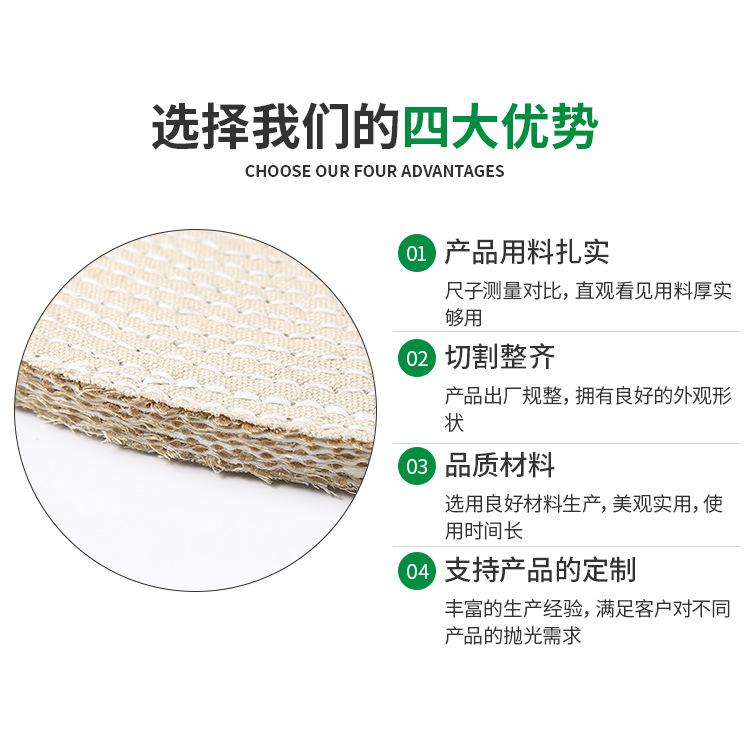 劍麻主要產(chǎn)于廣西本產(chǎn)品屬廣西很好的劍麻不偷片經(jīng)多道工序制作而成!對(duì)五金,眼鏡,拋磨有著耐磨不脫毛等特點(diǎn)!大小規(guī)格可按客戶加工!麻轆:可分為油麻轆和布麻轆。麻轆采用優(yōu)良劍麻為原材料,經(jīng)再三深加工布成為一種堅(jiān)硬的拋光材料,油麻轆主要用于不銹鋼制品自動(dòng)拋光生線,布麻轆通常用于拋金屬制品,種類齊全,規(guī)格有直徑50mm——500mm不等