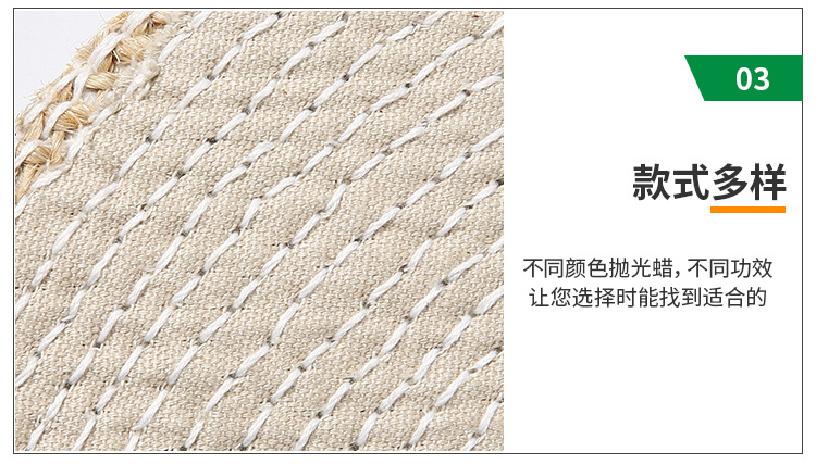 麻轆:可分為油麻轆和布麻轆。麻轆采用優(yōu)良劍麻為原材料,經(jīng)再三深加工布成為一種堅(jiān)硬的拋光材料,油麻轆主要用于不銹鋼制品自動(dòng)拋光生線,布麻轆通常用于拋金屬制品,種類齊全,規(guī)格有直徑50mm——500mm不等